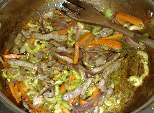 znaczy pociąłem cebulę, marchewkę jak tę Julkę..znaczy alla Julka...karkówkę zresztą też pociąłem...w paseczki...