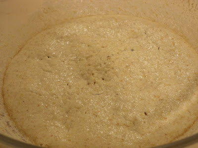 rozpuściłem około 12 g drożdży w ciepłej wodzie...tak około szklanki dosypałem tej brudnej mąki ...zamiąchałem i zostawiłem pod przykryciem około 2 godzin...;)